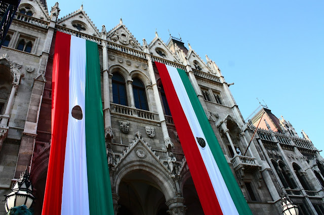 Depois do passeio a Buda, voltamos para Peste e começamos a visita pelo Parlamento, sobre o qual já falei no post anterior. Estava tendo um movimento estranho, um aglomerado de gente e o Parlamento estava coberto com a bandeira da Hungria com um furo no centro.