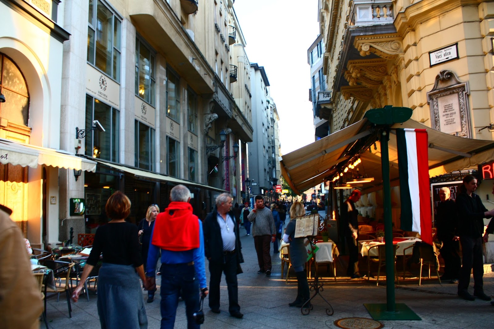 Dali pegamos o metrô e fomos pra Váci utca, principal rua de comércio da cidade e também, local de muitos restaurantes. Na verdade, é como se metade da rua fosse mais dedicada aos restaurantes e a outra metade às lojas.