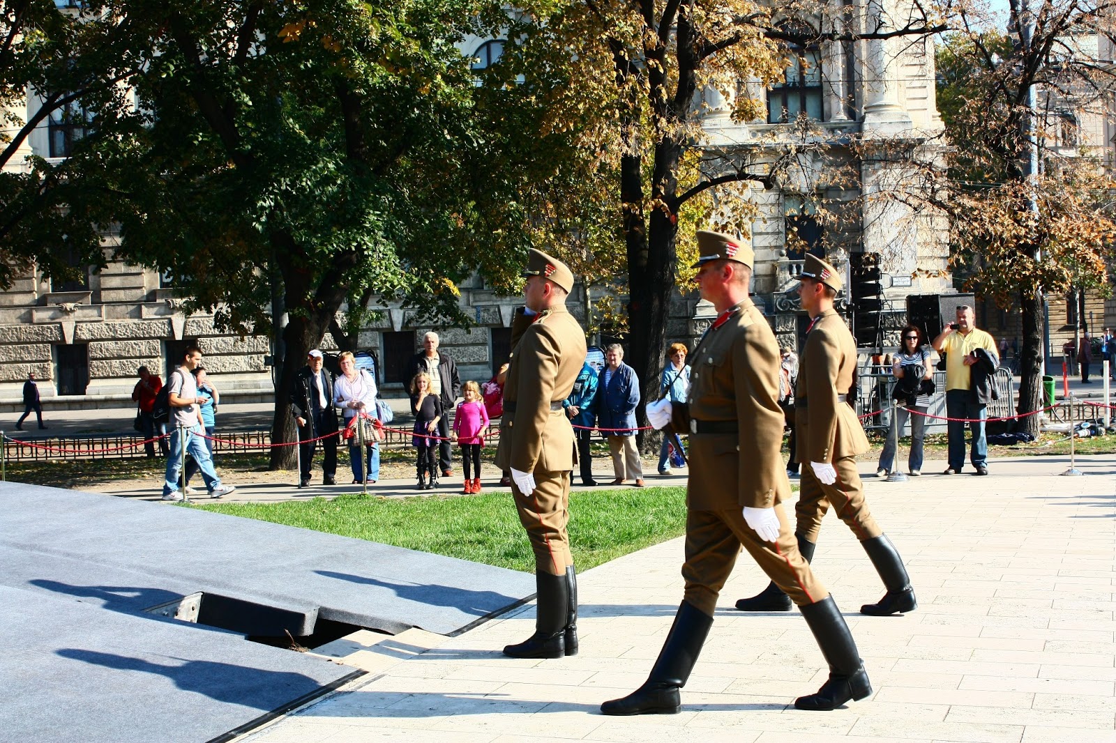 Olhando ao redor, descobrimos que, naquele dia, era feriado! 23 de Outubro é o dia que eles comemoram a Proclamação da República e libertação do governo soviético. Ficamos passeando pela praça, assistindo todas as solenidades desta data. O furo na bandeira representa os mais de 25.000 húngaros mortos na revolução.