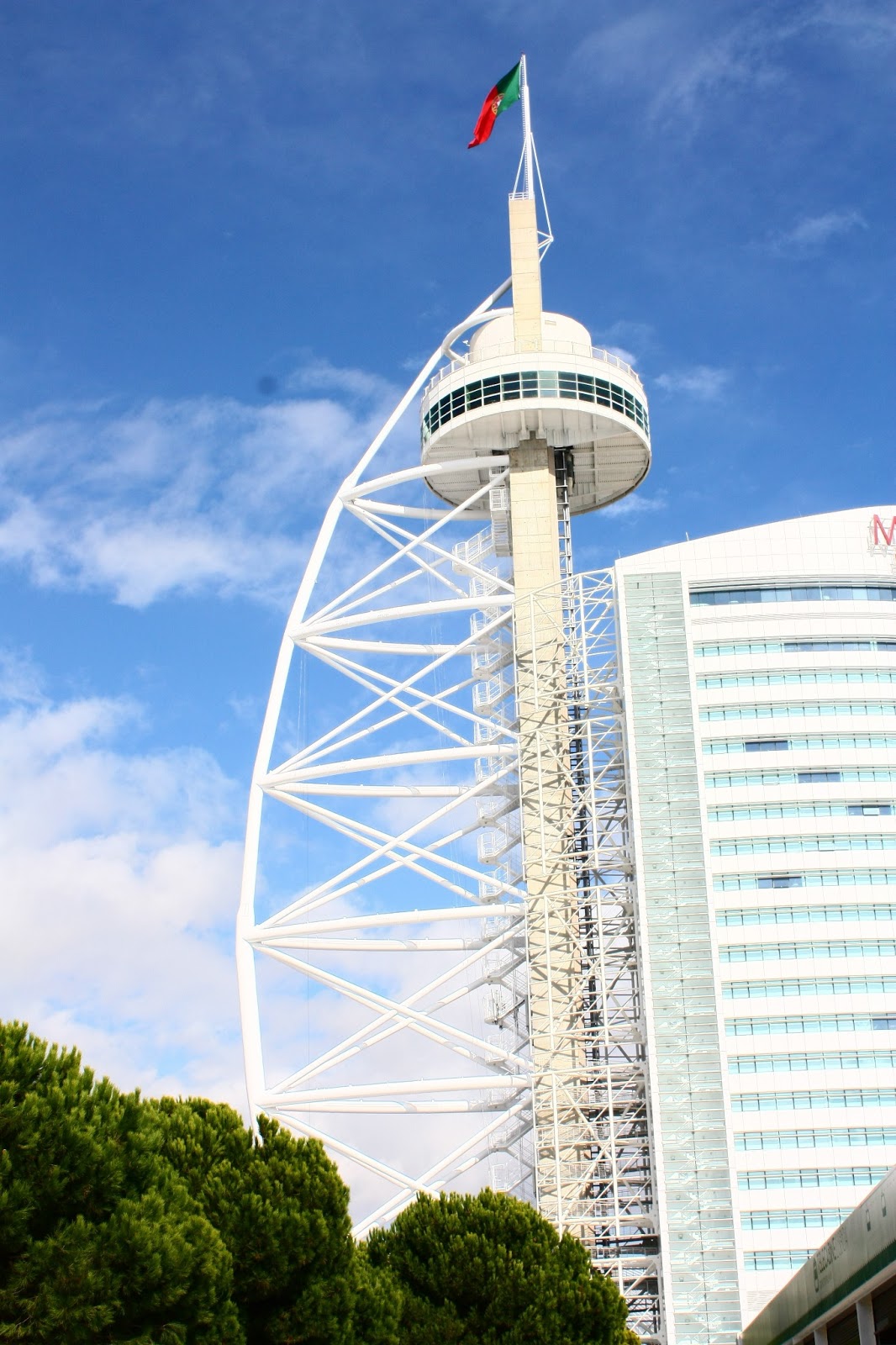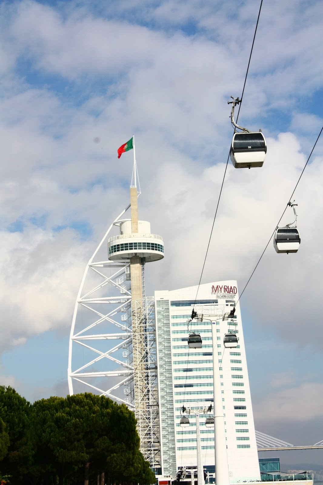 Atravessamos o shopping e seguimos por um enorme calçadão às margens do rio Tejo até chegarmos a uma torre que lembra o formato do Burj al Arab, em Dubai, onde tem o acesso ao teleférico, que acaba que te levando de volta à frente do shopping. Andamos bastante, tiramos umas fotos e voltamos pra dar uns rolês pelo shopping.