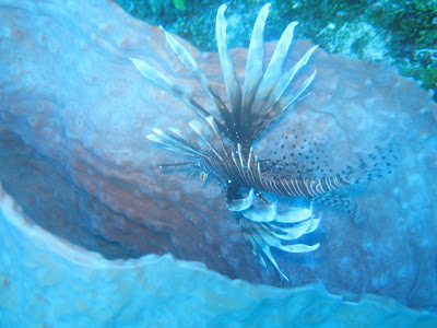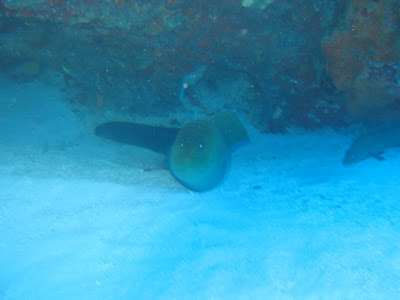 Primeiro fomos a um mergulho mais profundo, há cerca de 28 metros. Nossa, paguei o maior mico de todos os tempos! Havia muito tempo que não mergulhava de cilindro. Meu regulador estava muito sensível e aquilo estava me incomodando. Quando caí na água e ainda na superfície, tirei o regulador da boca e, quando ele caiu na água, saiu disparando o ar, fazendo o maior barulhão. Aquilo me deu a sensação que eu estava afundando e comecei a gritar por socorro (olha o mico!) Ainda bem que os israelenses e americanos não entendiam o que era socorro em português kkkkk. Bem, o instrutor veio e inflou meu colete (básico, né?!). Ele me deu um “pito” daqueles e eu logo tratei de me acalmar, pois não queria perder o mergulho. Eu estava em pânico. Acho que o stress que passei em meados de Abril e Maio já tinha começado desde aqui rsrs. Tratei de descer e fui equalizando o ouvido e foi tudo tranquilo. Relaxei e curti o mergulho. Vimos um caranguejo gigante e a maior moréia que já havia visto em todos os tempos. Como disse o Alessandro: “aquela moréia era de brinquedo, que a operadora colocou lá para nos enganar”. Mas era muuuito grande mesmo, jamais havia visto algo assim. Pena que nas fotos não dá pra ter noção do tamanho do bicho. Também neste mergulho vimos vários Lion fishes. No mais, eram centenas de peixinhos coloridos e muitos, mas muitos tipos de corais e esponjas, de todas as cores, formas e tamanhos possíveis. No segundo mergulho, fomos a Paradise, cerca de 12 metros de profundidade. Aqui, só muitos corais, gorgônias, esponjas e muitos peixinhos coloridos; um verdeiro jardim subaquático! Olha, não é porque sou brasileira não, mas quem ainda não foi mergulhar em Fernando de Noronha, não sabe o que está perdendo. Ainda vou fazer um post sobre Noronha e outras cidades do Brasil que já estive, mas já fica aí a recomendação: vá mergulhar em Noronha!!! Neste mergulho, o fotógrafo pta honrar a grana que iria receber, ficava atrás de mim o tempo todo, me pedindo mil poses debaixo d’água e, às vezes, até me irritava! Tirava mil fotos de mim e eu queria fotos dos peixes, dos corais, enfim, da vida marinha. Mas enfim, ele estava fazendo o trabalho dele. Depois eu ia ver se tinha me agradado ou não.
