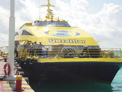 Os ferries são super confortáveis, com ar e serviços de bordo, caso alguém queira ir tomando uma geladinha no caminho. A viagem dura uns 40 minutos. Quando o ferry vai se aproximando de Cozumel, você começa a ficar boquiaberta com o tom de azul daquela água! Do barco, dá pra ver o fundo do mar e era fundo mesmo! Lindo!!!
