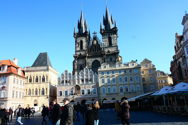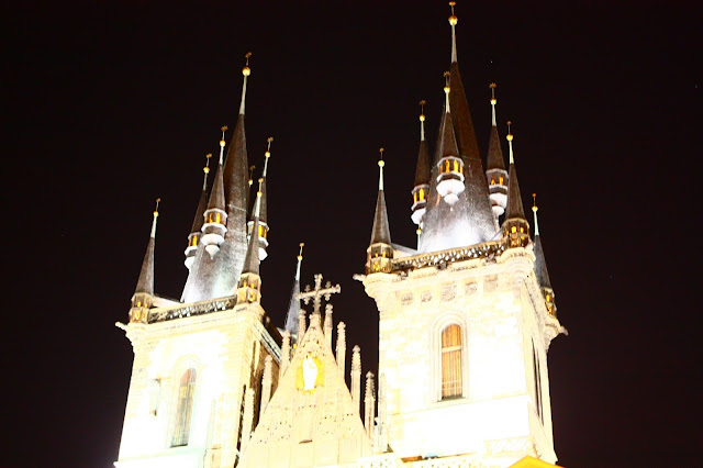 O relógio é sem dúvida, maravilhoso, mas não é só ele que chama a atenção na Praça. A fachada da Tiny Church é maravilhosa; um belo exemplo da arquitetura romântica de Praga. Ela data do século XIV e é uma das igrejas mais lindas que já vi, principalmente durante à noite, quando adquire uma iluminação peculiar que a deixa ainda mais bela!