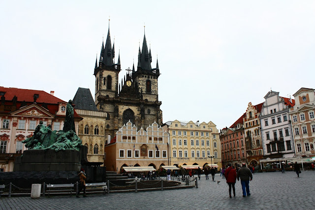 No centro da Praça está a estátua de Haus, reformador religioso que foi queimado vivo.